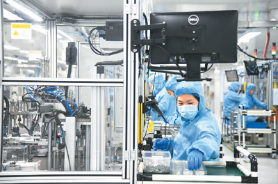 位于安徽省芜湖市湾沚区的森萨塔科技(芜湖)有限公司内,工人在无尘车间生产新能源汽车零部件继电器。